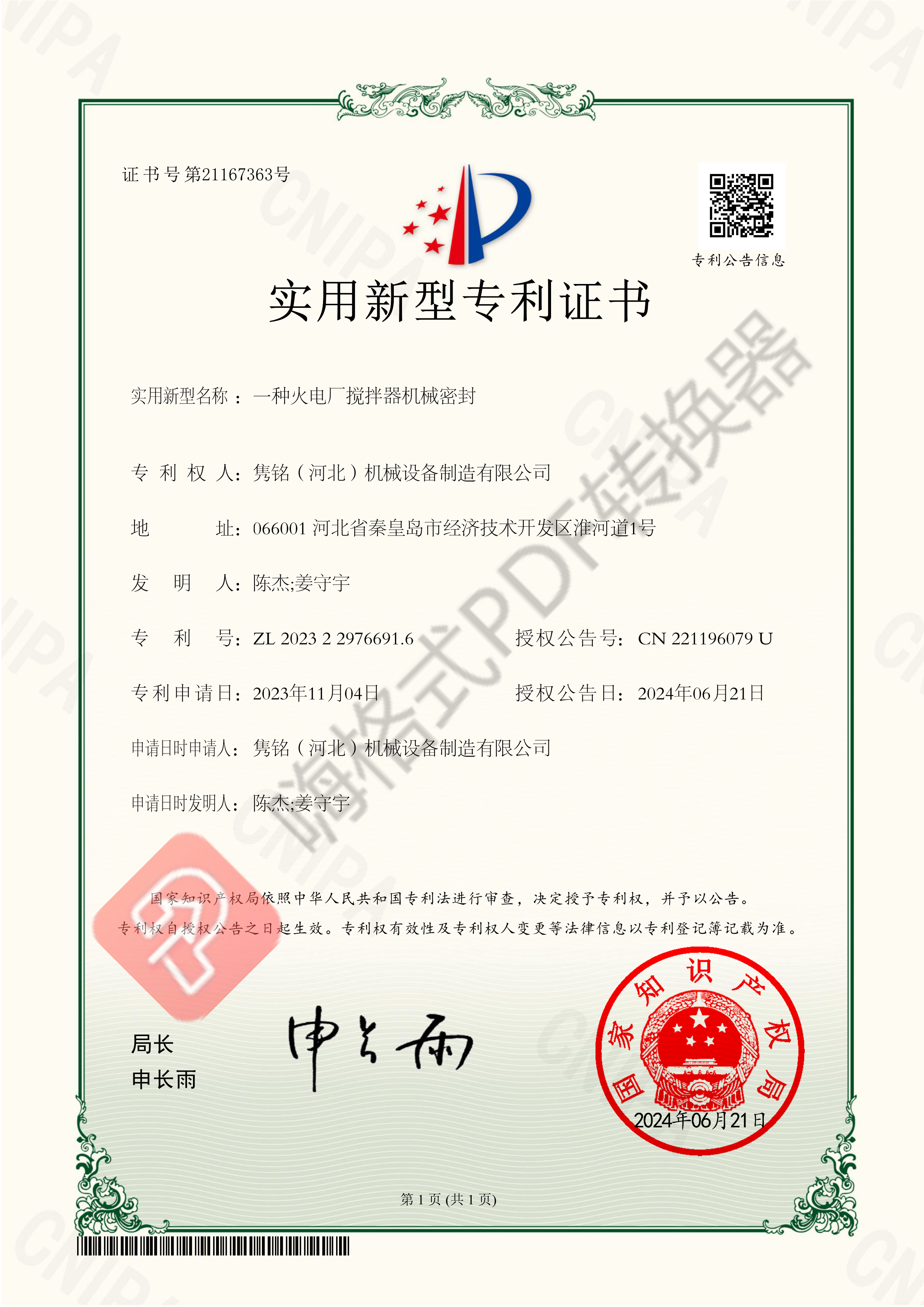 熱烈祝賀我公司研發(fā)的一種火電廠攪拌器機(jī)械密封,于2024年6月21日獲國(guó)家知識(shí)產(chǎn)權(quán)局發(fā)明專利授權(quán)!專利號(hào)ZL 2023 2 2976691.6。