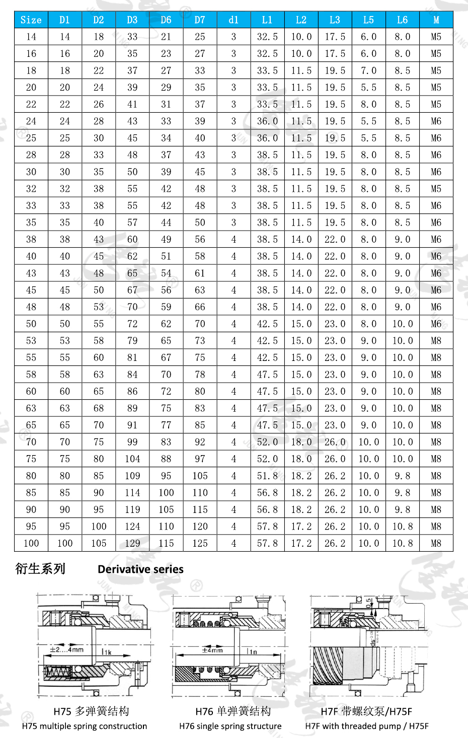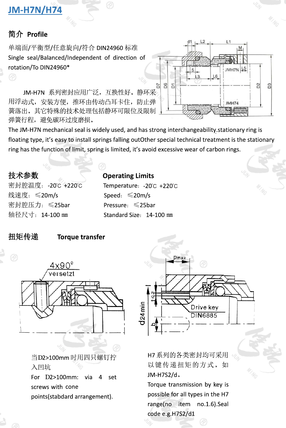 H7N系列密封應(yīng)用廣泛,互換性好。靜環(huán)采用浮動式,安裝方便,推環(huán)由傳動搭子卡住,防止彈簧落出。其它特殊的技術(shù)處理包括靜環(huán)可限位及限制彈簧行程,避免碳環(huán)過度磨損。