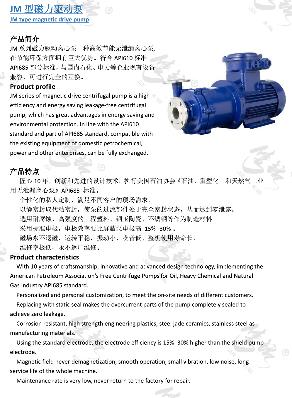JM系列磁力驅動離心泵一種高效節(jié)能無泄漏離心泵, 在節(jié)能環(huán)保方面擁有巨大優(yōu)勢。符合API610標準API685部分標準,與國內石化、電力等企業(yè)現(xiàn)有設備兼容,可進行完全的互換。